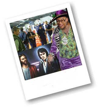 My friends thought I was crazy for paying over $55 for this black velvet painting of Jesus looking screwy at Elvis, but I know what I like...And it looks like a Million Bucks in my studying room."
